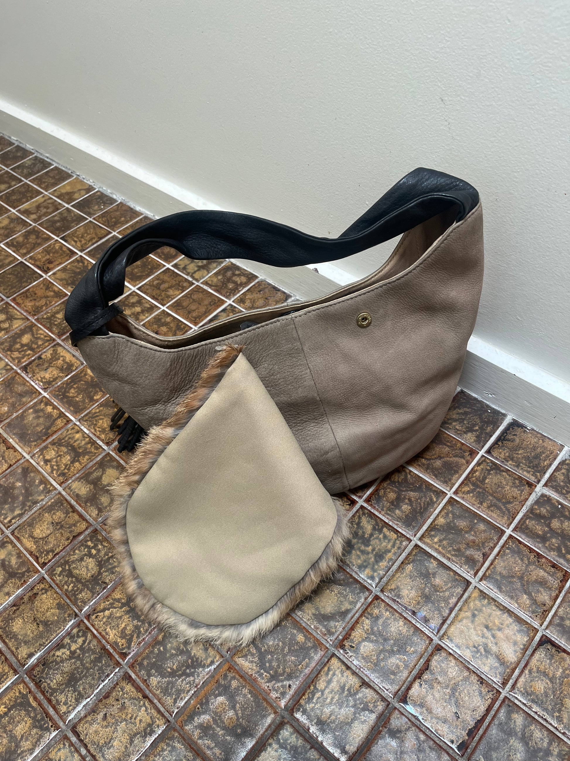 MATERIAL: Suede body, leather handle & rabbit fur.