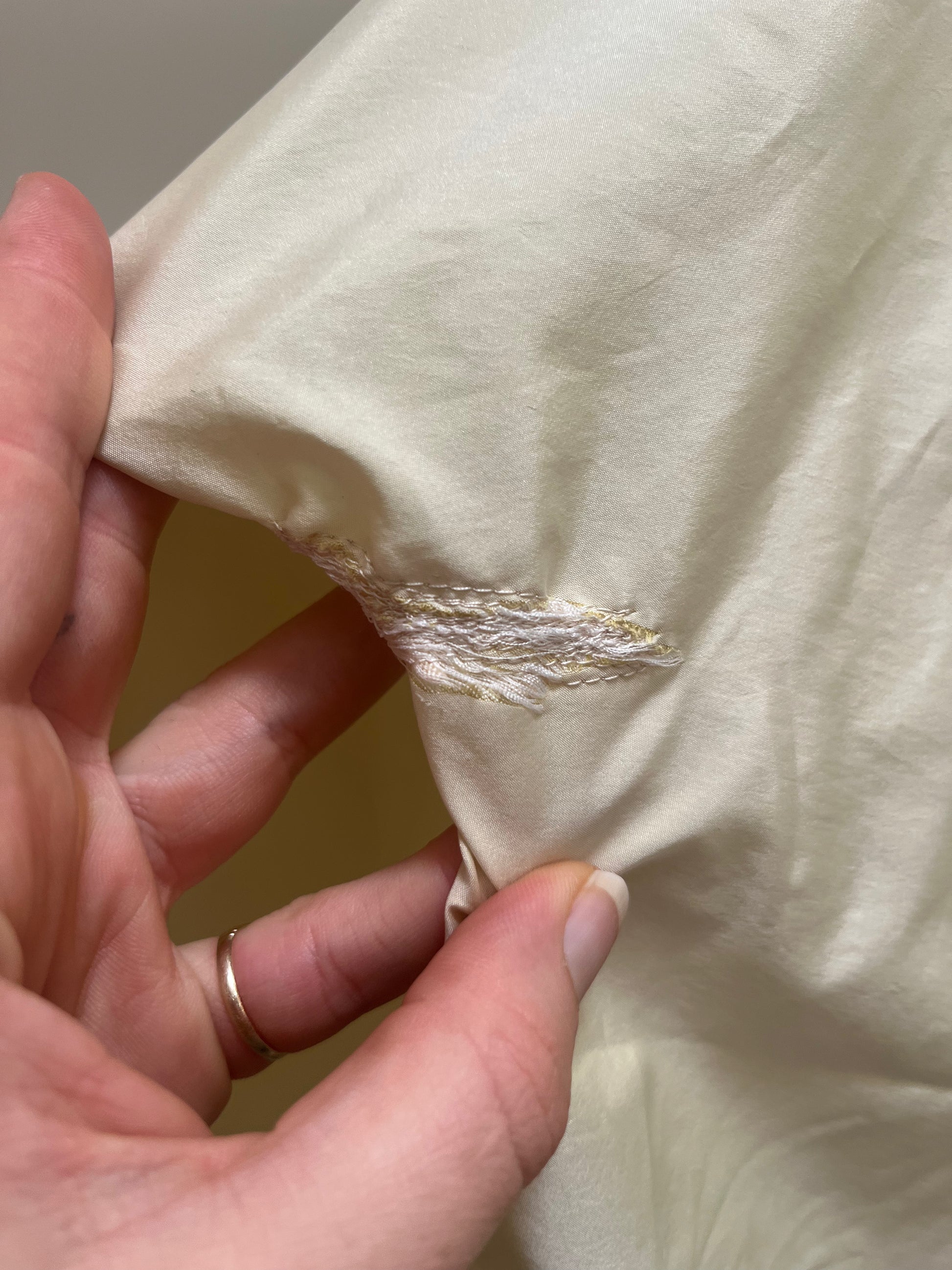 Please refer to imagery for underarm condition, fabric has been repaired however still presents holes, priced accordingly.