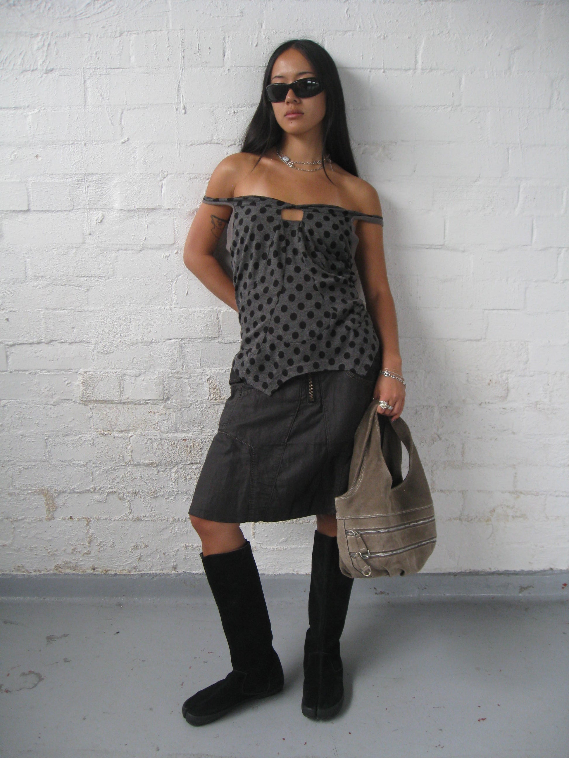 -Grey base with black polka dots