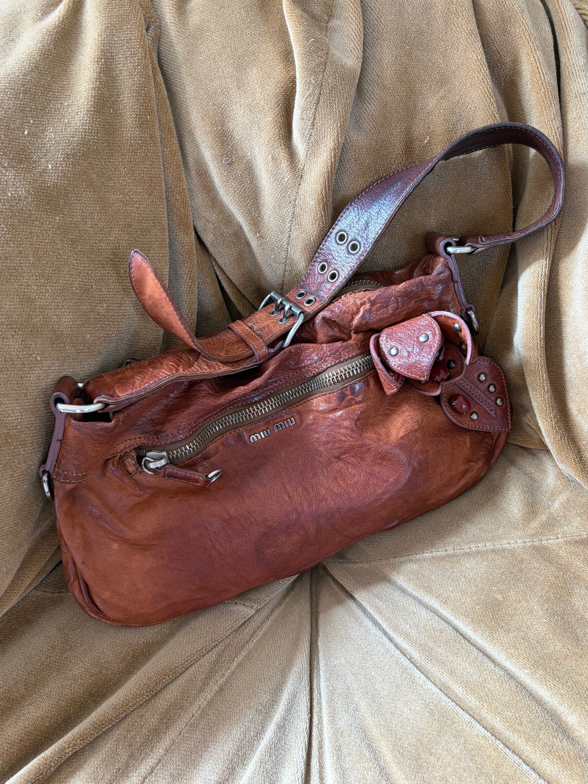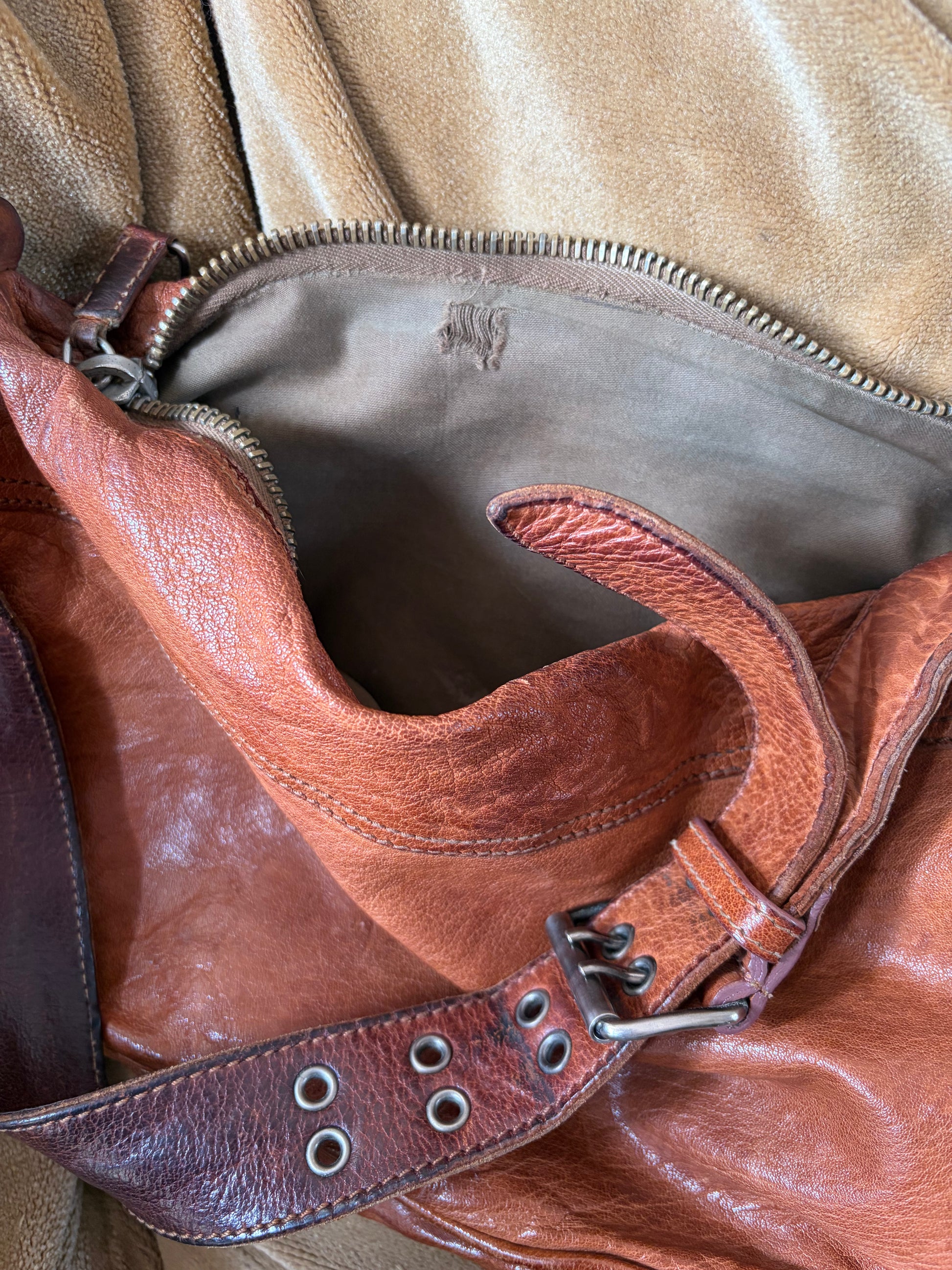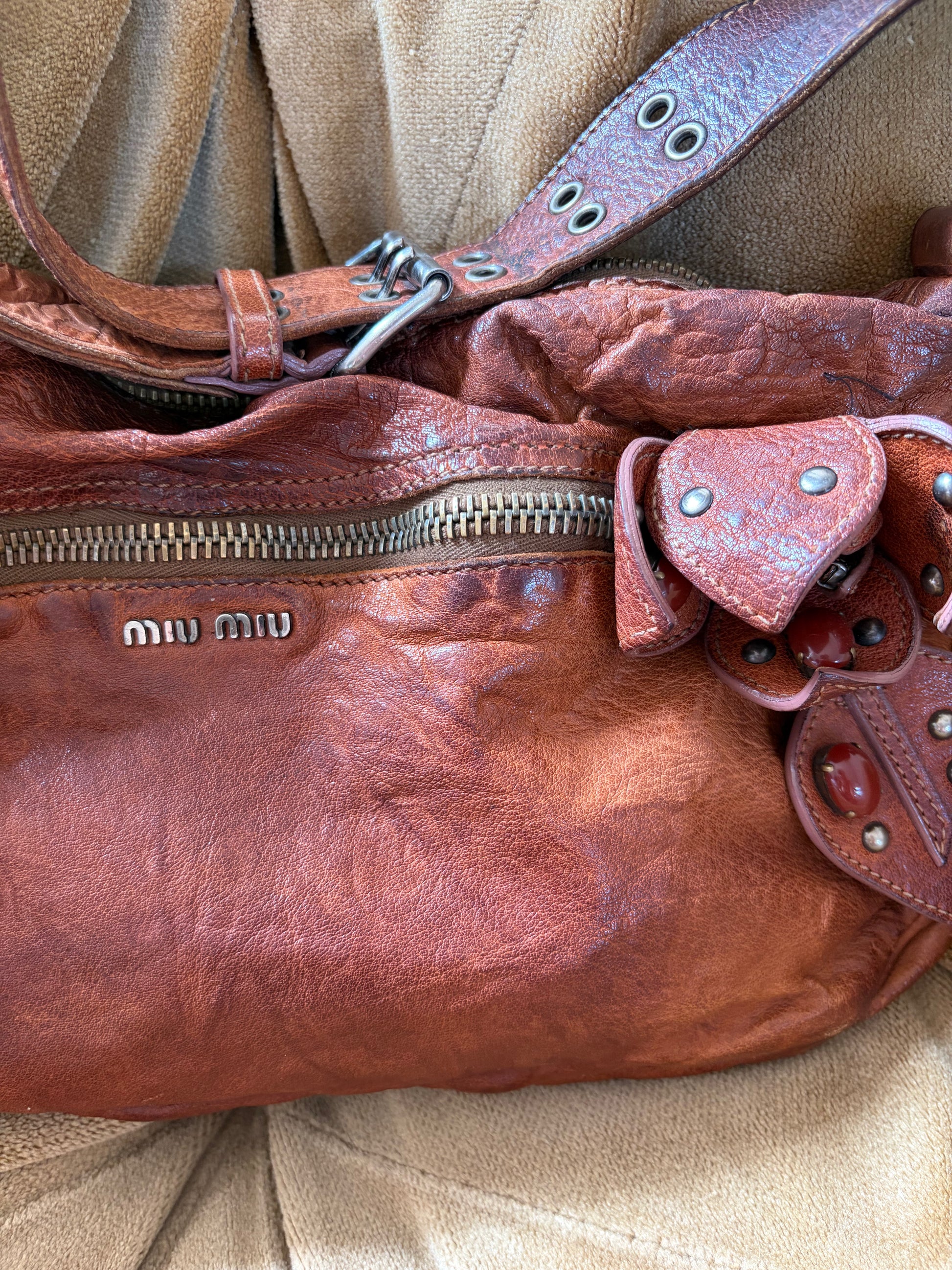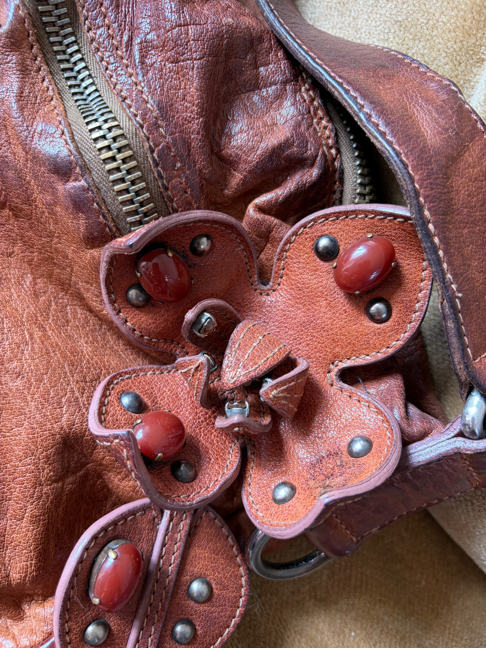 In overall good condition. Natural signs of wear to the leather consistent with age and wear. One of the large orange beads is missing from inside the flower; a small mark and tear on the interior lining, please refer to the imagery.